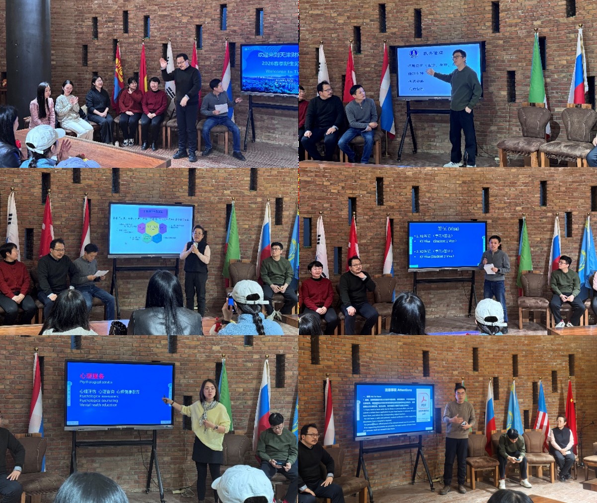 随后,教研室任课教师及行政办公室各位老师分别围绕汉语课程体系、教学管理、考勤要求、后勤保障、签证办理、请假规定、心理辅导等核心工作进行详细说明,为新生们梳理学习生活流程,提醒注意事项。